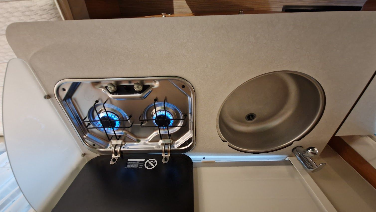 Küche mit XXL-Kompressorkühlschrank mit 90 l Kühlschrankvolumen und integriertem Gefrierfach, die Toilette mit externem Waschbecken - Hinten: