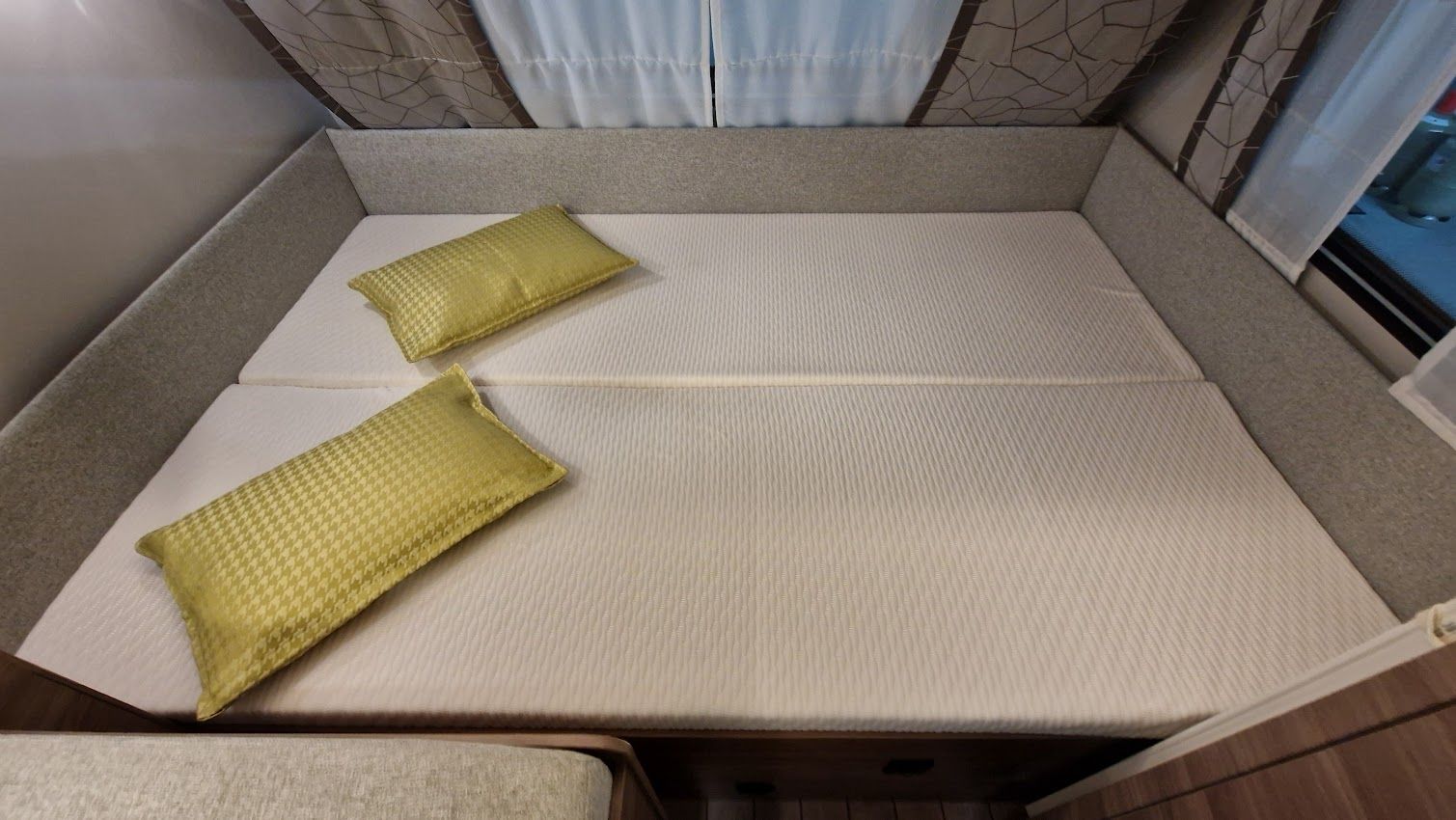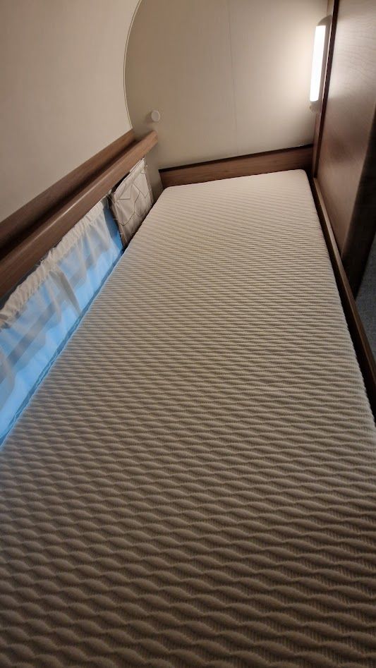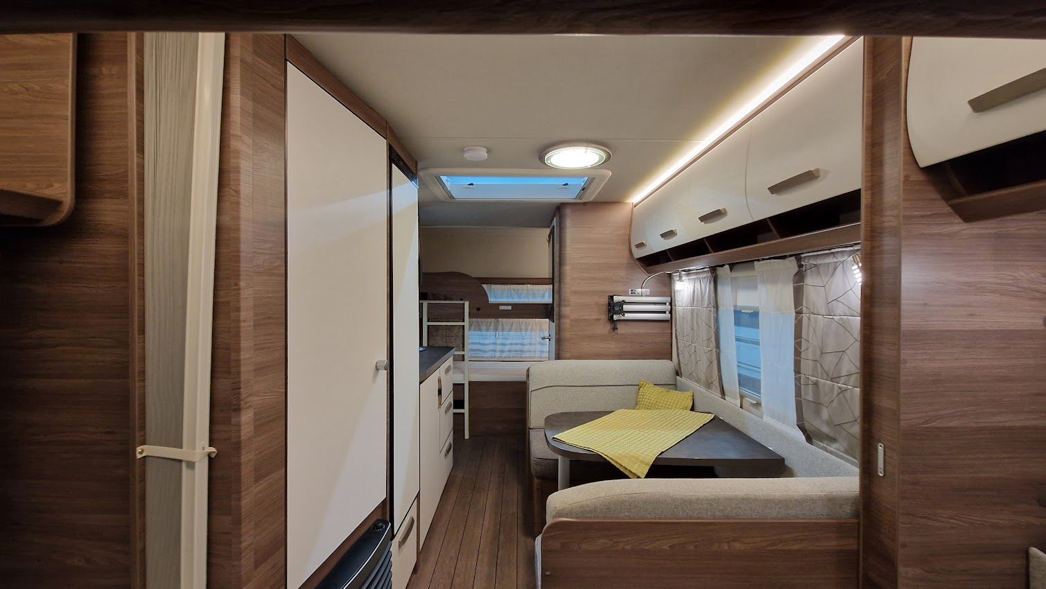Hinten: 2 Etagenbetten (1x210x72 cm) und (1x200x72 cm) daneben die Toilette mit externem Waschbecken. Das unterste Bett kann man hochklappen für einen großen Stauraum.