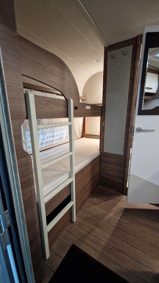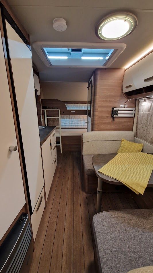 Dieser schön gepflegte Wohnwagen ist ideal für Familien mit Kindern für (4-6 Personen); keine Tierhaltung und Nichtraucherwohnwagen. Hinten befinden sich die Etagenbetten (bis 80 kg), Festbett im Bug für 2 Erwachsene und eine extra Schlafgelegenheit für 1-2 Personen in der Mitte. Polster COOL-GREY.