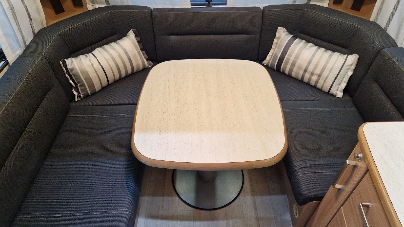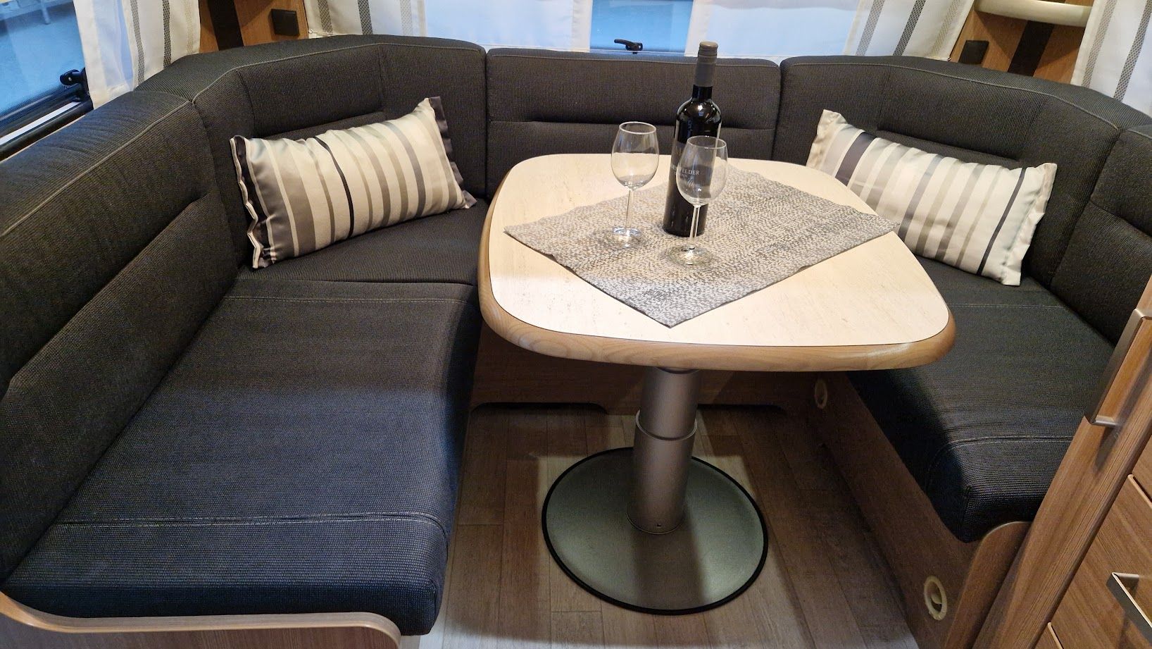 - Rundsitzgruppe mit Säulentisch umbaubar zu einer weiteren Schlafmöglichkeit 142/135x210 cm