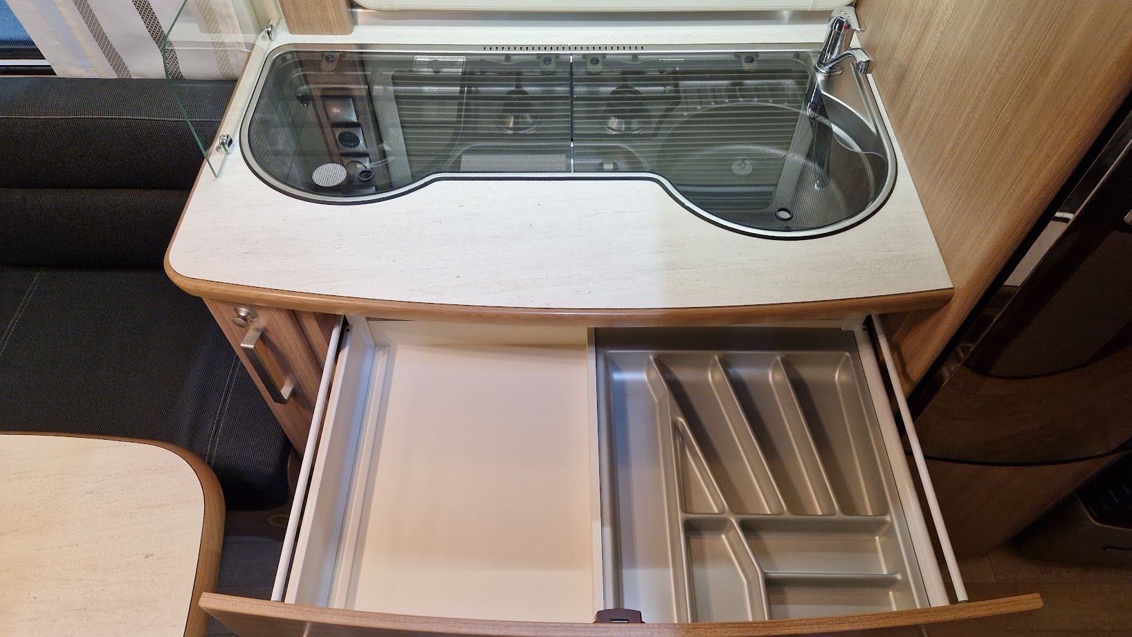 - räumige Küche mit Soft-Close-Schubladen und Super Slim Kühlschrank 150 ltr. gegenüber ist die Toilette