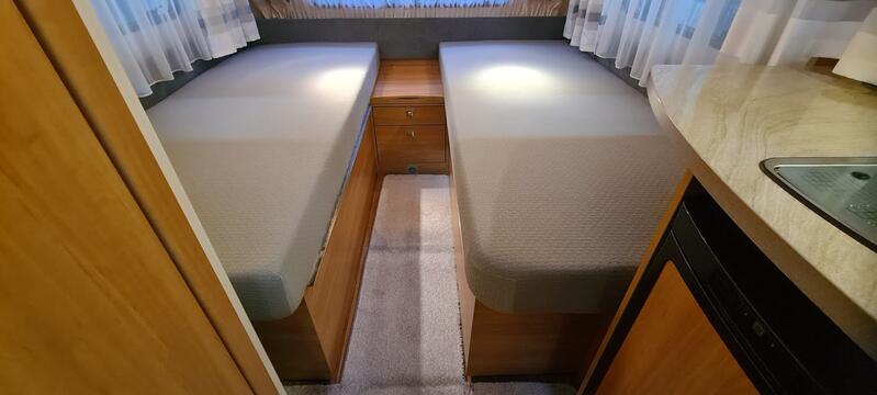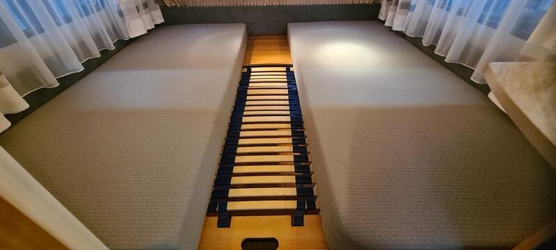 - 2 einzelne Betten, Maße 2 x 80 x 200 cm mit 2 Matratzen und Lattenrost. Eine extra Lattenrost ausziehbar mit Matratze für eine große Liegefläche 200 x 200 cm ab Werk dazu.