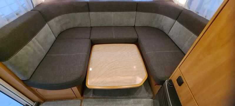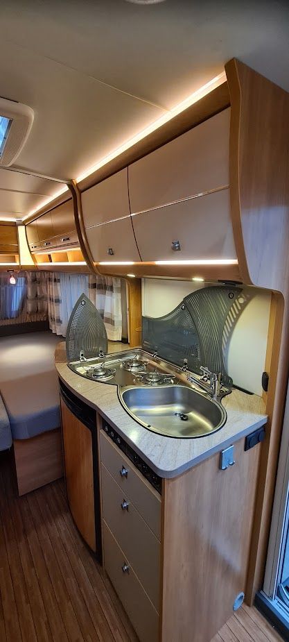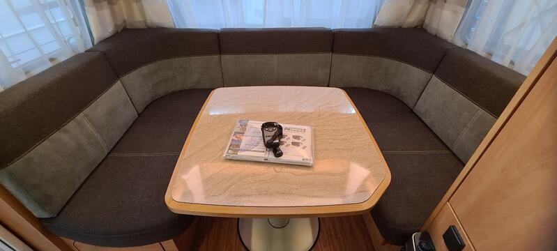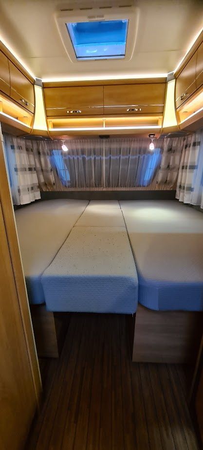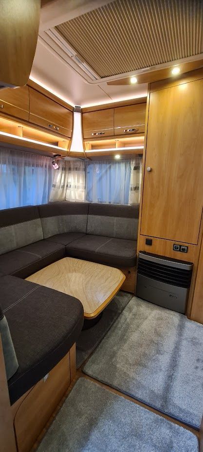 Wohnwagen befindet sich in einem tadellosen sauberen Zustand, Nichtraucher, keine Tierhaltung, und scheckheftgepflegt; mit Bugfenster. Wohnliches Möbeldekor im hellen Calva Apfel mit elegant gerundeten Dachschränken, Dachschrankklappen-Design mit cremefarbenen Einfassungen.