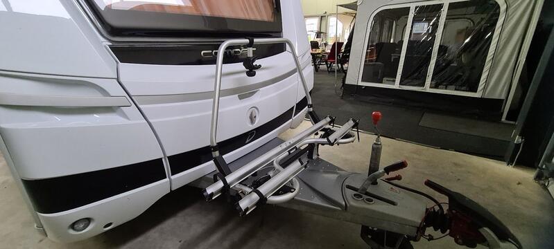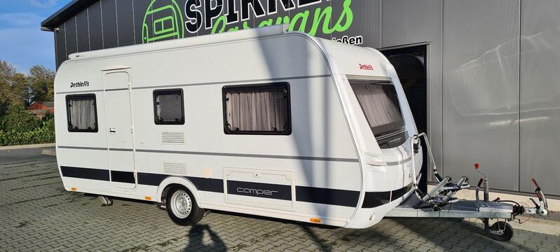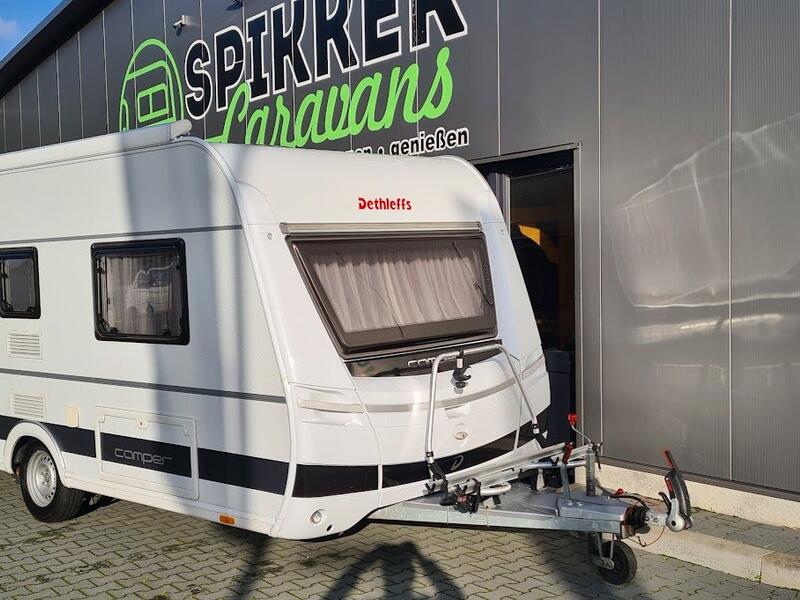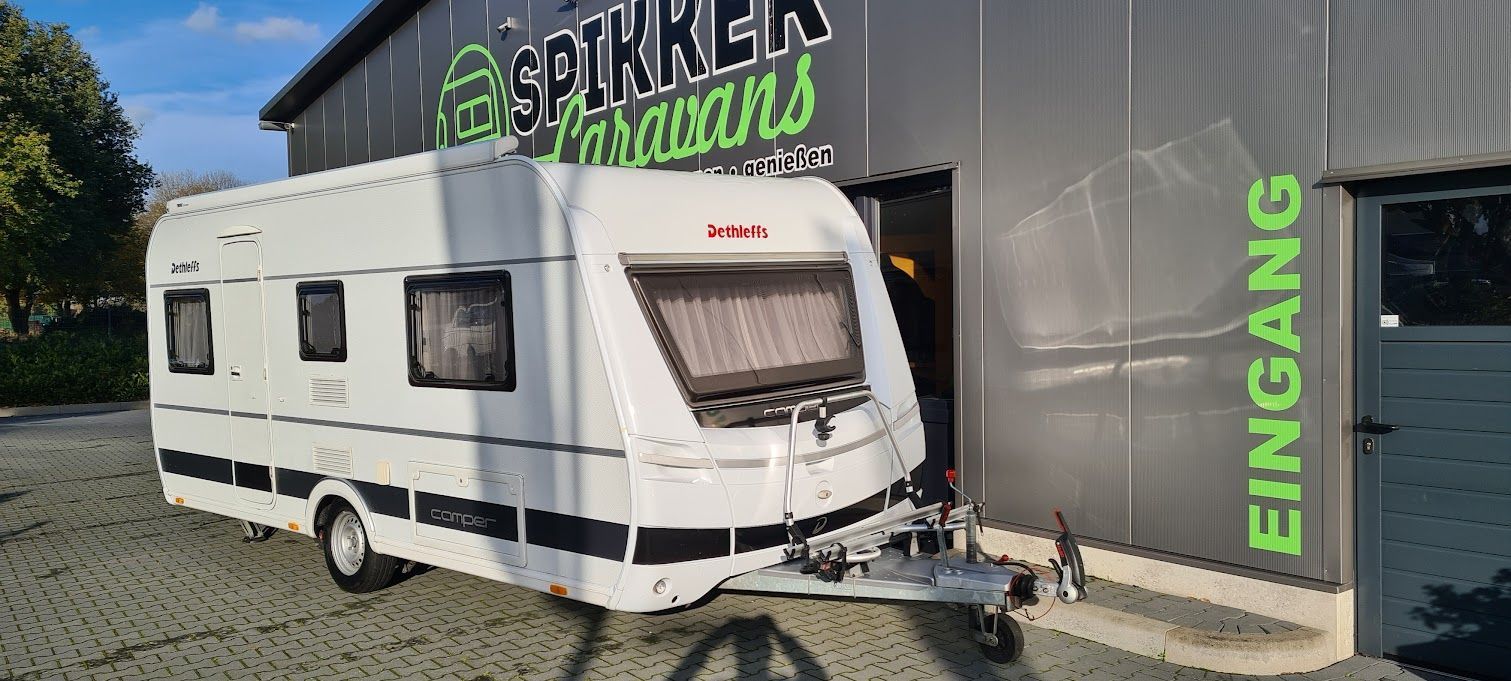 DETHLEFFS 470 ER Camper aus 2014 ausgestattet mit Bugfenster, Thule Markise auf dem Dach montiert, Mover Enduro mit Fernbedienung, Lithium-Paket, Fliegenschutztür, Doréma Sonnensegel mit Seitenwände, Thule Fahrradträger Superb vorne für 2 Fahrräder oder E-Bikes, extra 230 V. Steckdosen, Antennenanschluss mit 230 V. Außensteckdose, Tempo 100 Zulassung, Camper Family-Paket inklusive. Wohnwagen hat ein hagelgeschütztes Dach von GFK.