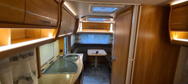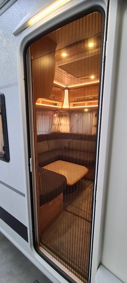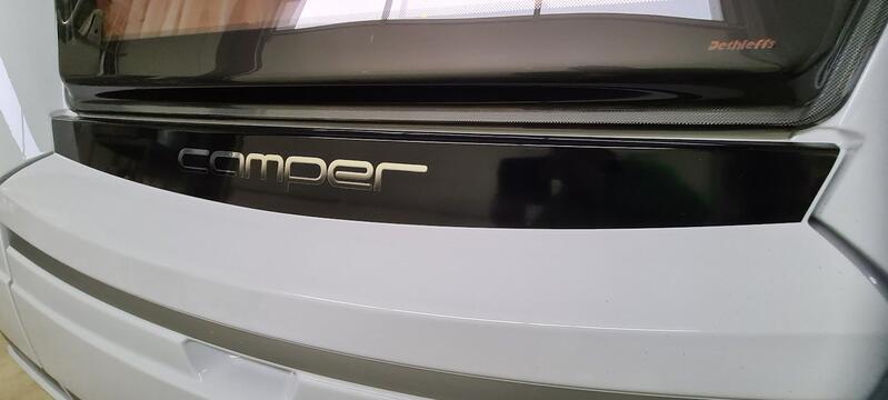Neues Möbelkonzept mit nach unten hin eingezogenen Dachschränken für mehr Kopffreiheit und ein besseres Raumgefühl. Hauptlicht im Eingangsbereich ist vom Schlafzimmer und vom Eingang aus schaltbar. Die schön beleuchteten Eckmodule sind standard beim CAMPER 470 ER / Calva Apfel/ JOY/ARABICA CAMPER Camper-Klasse. Modern gestaltetes Heck mit dreiteiligem Leuchtenträger.