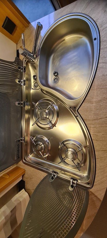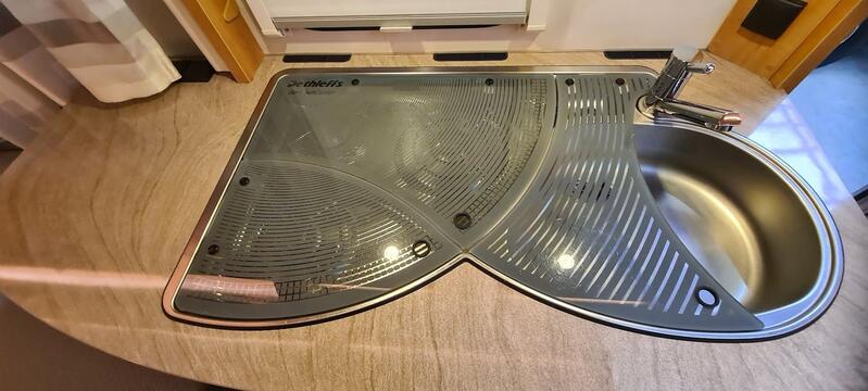 - Edelstahlspüle mit Warmwasser und Abdeckung